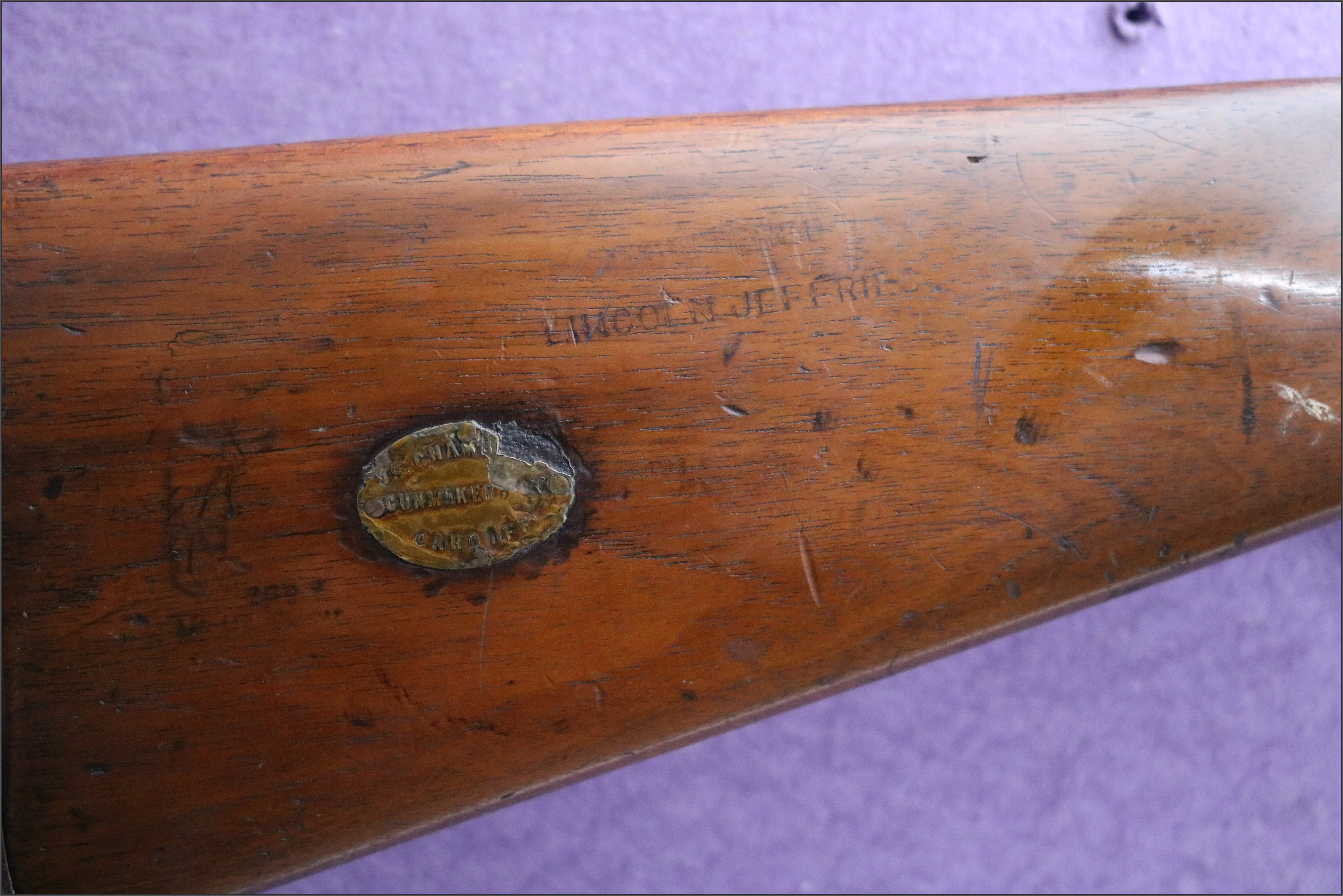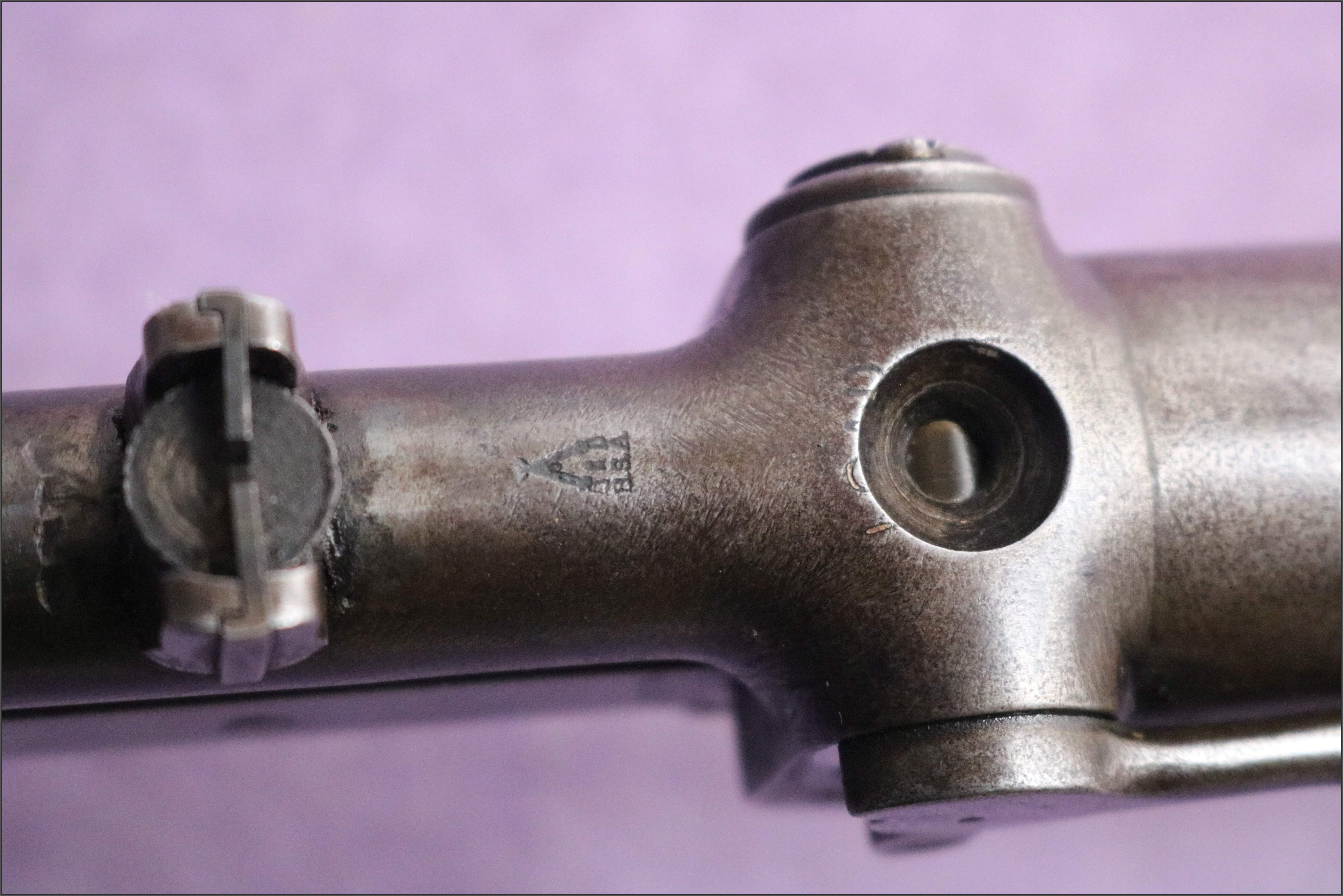 Importantly, this example remains complete, retaining both original front and rear sights, which are frequently missing on surviving Lincoln-Jeffries rifles. The tap aperture is the earlier, larger form, consistent with early production H-models, and the overall configuration matches known early examples rather than later standardised variants.
