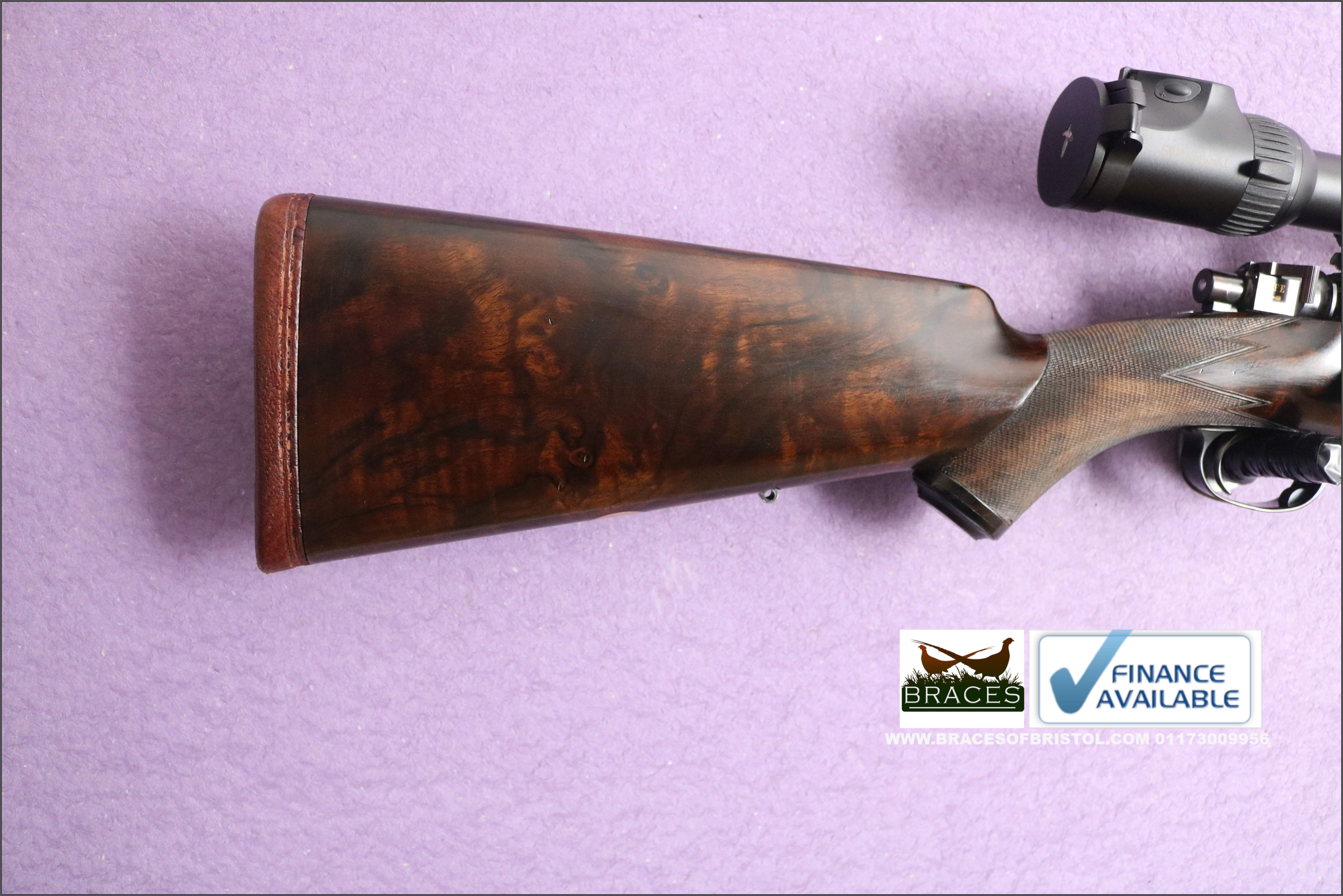 A richly figured dark walnut stock completes the package, featuring a cheekpiece, finely executed hand-cut chequering on the grip and forend, a grip cap, and a Silvers recoil pad. Sling attachment points are thoughtfully matched, with a banded front fitting aligned to the barrel.